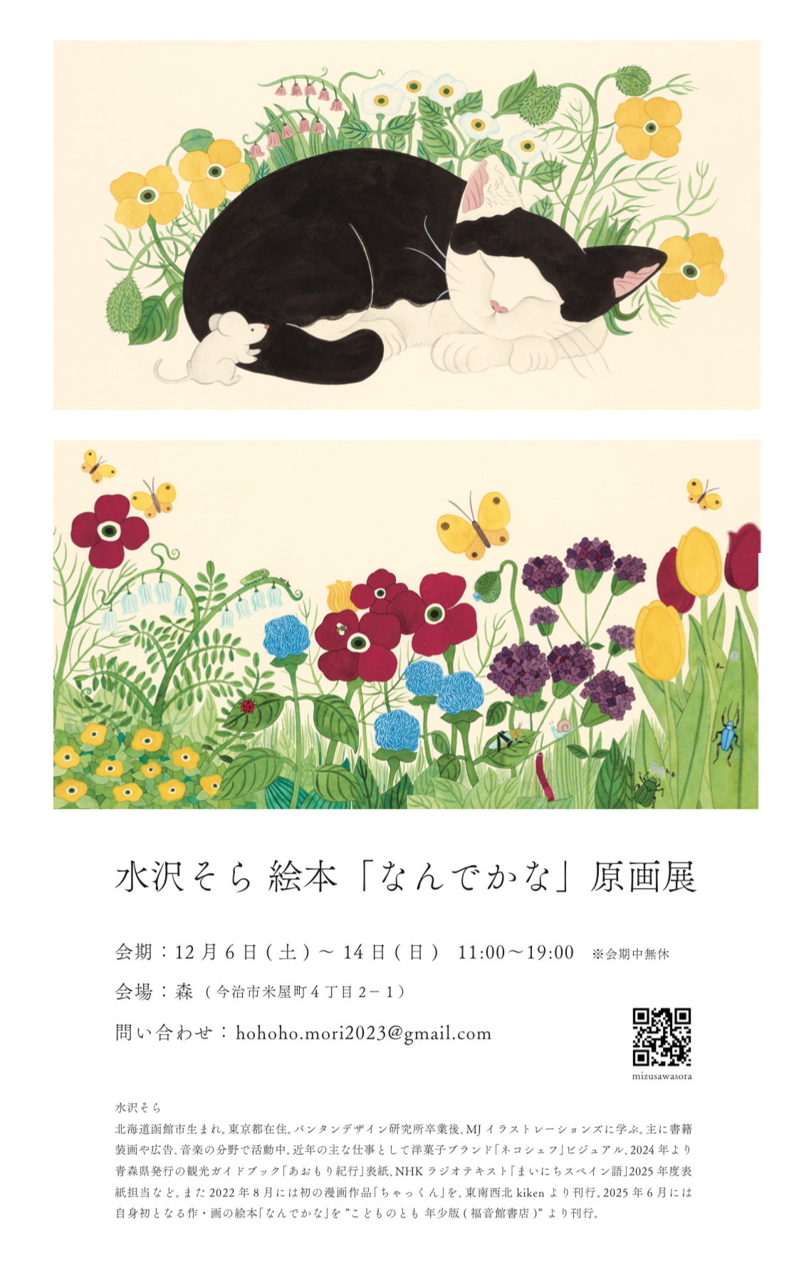2025.12.08 絵本『なんでかな』原画展、今治開催のご案内 12月6日(土)より12月14日(日)まで愛媛県今治市の書店、森にて絵本『なんでかな』の原画展を開催いたします。期間中12日には在廊と夜19時よりトークセッションも予定しておりますので、お近くにお住まいの方はぜひお越しくださいませ。水沢そら 絵本『なんでかな』原画展会期:2025年12月06日(土)-12月14日(日)会場:森( 〒794-0021 愛媛県今治市米屋町4丁目2−1)Instagram11:00-19:00(会期中無休) NEWS LIST